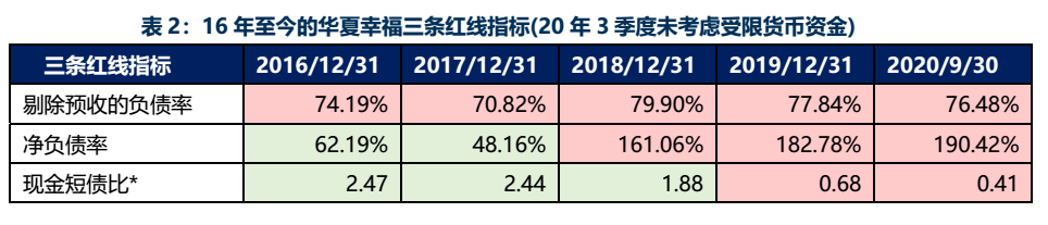 在平安戰略入股的180億元之外,華夏幸福近年的業務仍是依賴借外債模式支持,而業務模式上的資金回流緩慢仍是其最大弊病。從三條紅線指標動態變化可見,18年后高有息負債壓垮了華夏幸福的依靠業務翻身的機會。