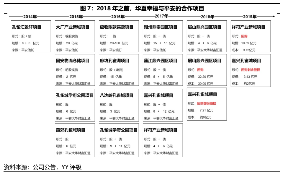 在平安戰略入股進場前,自14年開始便與華夏幸福深度合作,呈現一方加杠桿、一方賺項目資源的互惠模式。雖然這類合作項目公告多宣稱為“股性投資”,但就其短時間即退出和相關的回購動作,或存在明股實債的性質。根據圖7,由于應收賬款買賣項目合作情況未詳細披露,總合作規模約在182到262億元之間,相關合作項目均已退出。