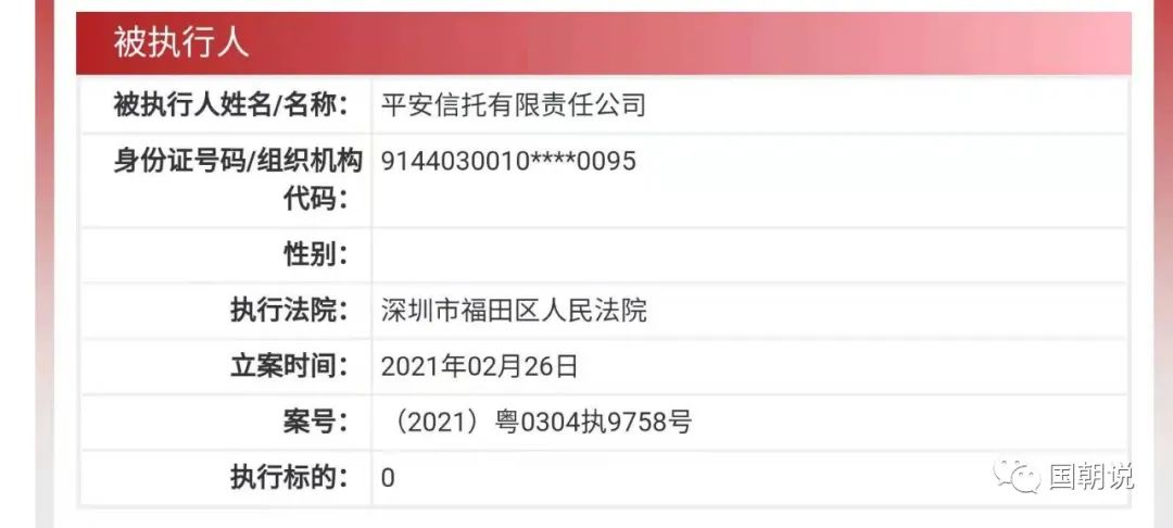 2021年2月26日,平安信托有限責任公司被深圳市福田區人民法院列為被執行人,案號(2021)粵0304執9758號,執行標的顯示為“0”元,由于中國執行信息公開網上并沒有提供更多信息,從案號上來看,這或許跟一樁集合信托糾紛案有關。