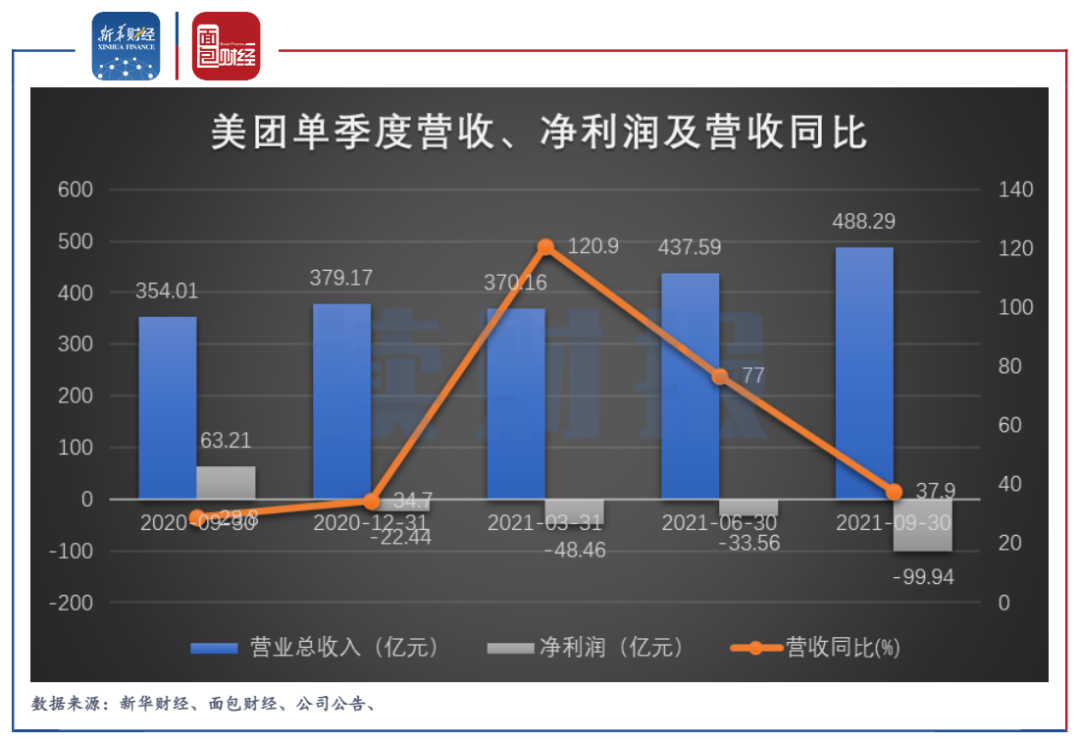 三季報(bào)顯示,美團(tuán)營收雖然在上漲,但增速明顯放緩。美團(tuán)第三季度的營收為488.29億元,同比增長37.9%,但增速較上季度下降39.1個(gè)百分點(diǎn)。