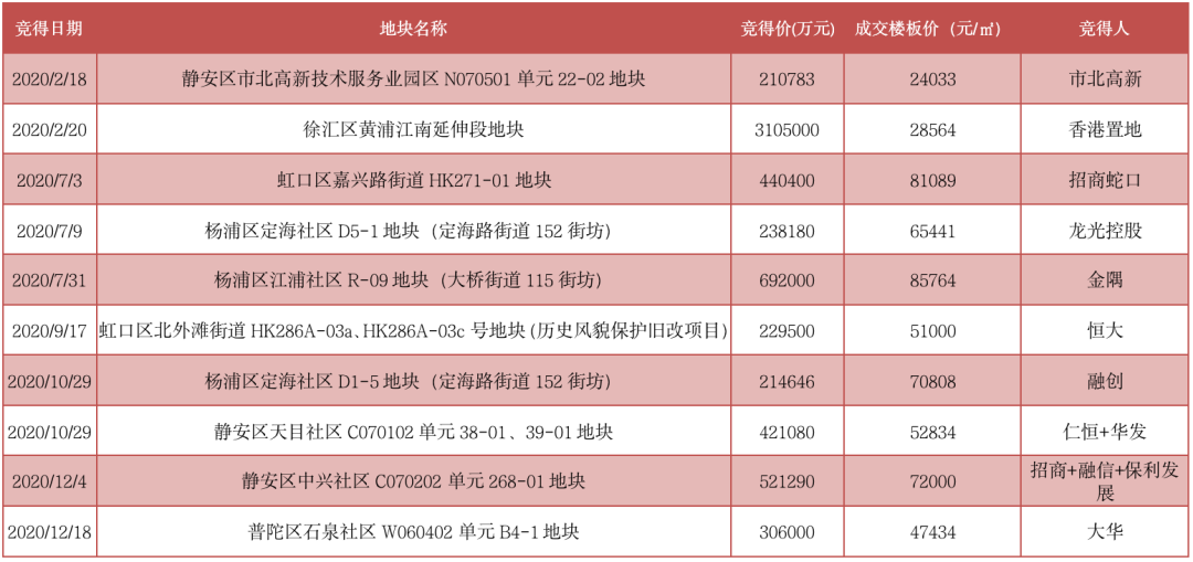 表:2020年上海核心區域部分地塊