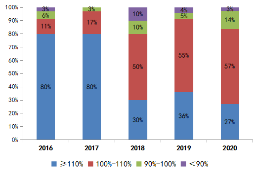 而從2020年房企的目標完成情況來看,受疫情影響,2020年企業整體的業績完成情況不十分理想,目標完成度超110%的房企數量不及2019年,僅占提出全年業績目標房企的27%,為近5年最低。