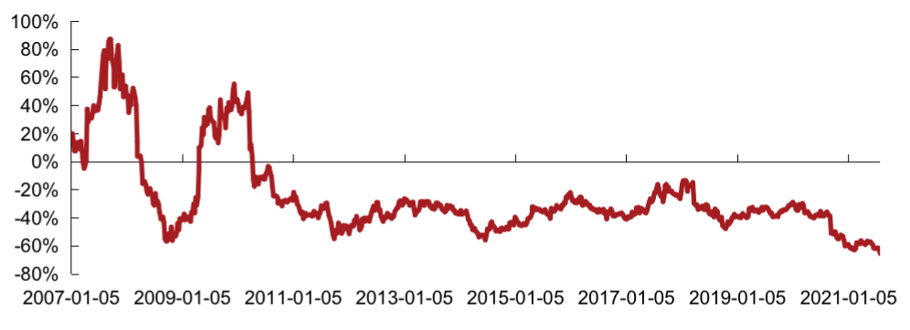 整體來看,7月克而瑞內房股領先指數成分股相對香港地產股大樣本整體PB較上月回落。7月該相對PB周均值為6.2%,低于上月相對PB周均值7.1%,低于2020年全年相對PB周均值21.9%。