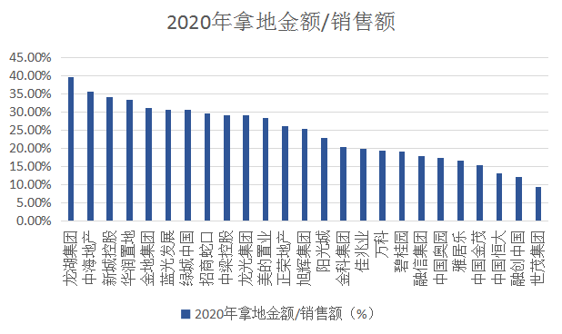 事實上,從2020年30強開發商拿地金額與年度銷售額之比來看,絕大部分30強開發商實際拿地金額與銷售比大約在15%~30%,其中龍湖集團、中海地產占比較高,分別為39.57%、35.55%。