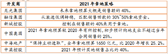 睿和智庫對30強開發商2021年的經營策略進行統計分析,在拿地態度上,30強開發商大都已經從激進到轉穩,“審慎”、“謹慎”、“放緩”成為拿地關鍵詞。部分開發商在年報或業績說明會上,已明確提出將拿地預算控制在銷售額的40%以內。