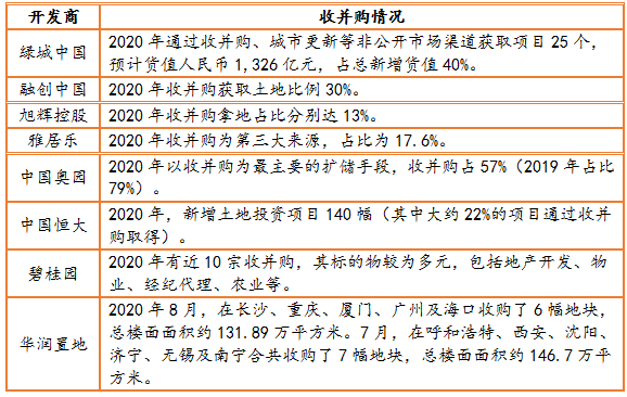 根據睿和智庫調研,通過收并購獲取土地資源已成為30強開發商的一個主要拿地方式。部分30強開發商收并購貨值占比較高,如融創中國2020年收并購獲取土地比例達到30%。