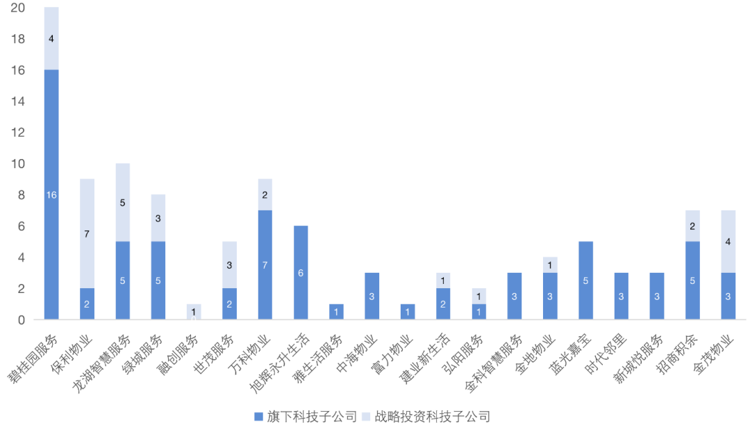 根據克而瑞發(fā)布的2020年度中國地產數(shù)字力TOP20物企榜單來看,前20的頭部物企正在積極成立或戰(zhàn)略投資科技公司,為企業(yè)數(shù)字化管理賦能。目前,這些企業(yè)旗下共有110家科技公司被孵化或戰(zhàn)略投資。