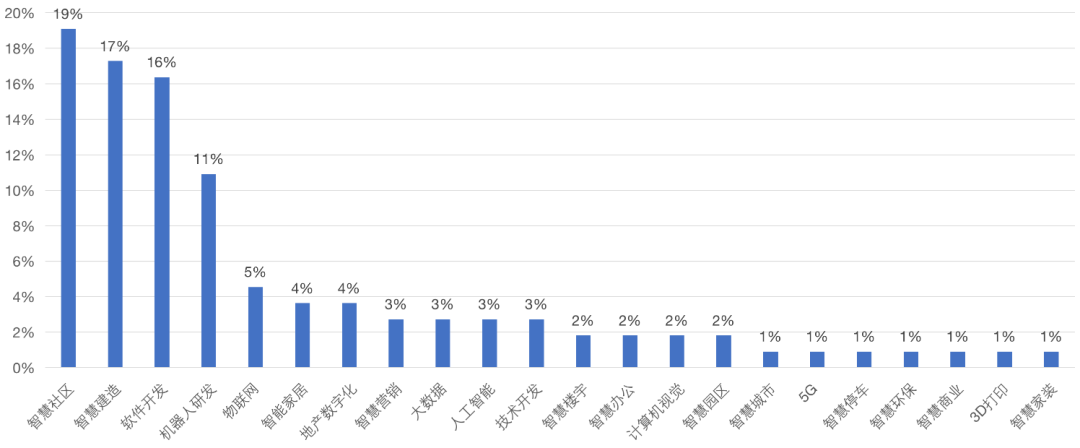 同時,成立或投資的科技企業(yè)所涉及的業(yè)務類型較廣,據克而瑞科創(chuàng)統(tǒng)計分析,科技企業(yè)的業(yè)務方向達到22個,其中智慧社區(qū)、智慧建造、軟件開發(fā)占據前三位,分別占比19%、17%和16%。目前,軟件開發(fā)行業(yè)的技術已經基本趨向于成熟,對于房企來說,布局軟件開發(fā)的科技企業(yè)相對比較容易,因此軟件開發(fā)的科技企業(yè)數(shù)量較多。但是進軍一個科技垂直化領域并非一件易事,從統(tǒng)計數(shù)據來看,物企所投資的科技企業(yè)現(xiàn)階段更多是處在智慧社區(qū)和智慧建造兩個領域。