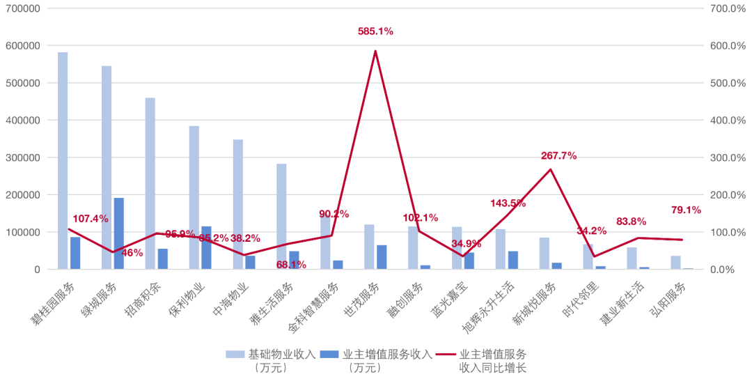 根據克而瑞科創(chuàng)的統(tǒng)計結果顯示,TOP20的物企盡管收入仍主要來自基礎物業(yè)服務,但增值服務的收入增長率非常高,從公司的年報和招股書上可以看出,各家都在積極部署多元化的社區(qū)增值服務以提高公司的毛利率,滿足業(yè)主日益增長的個性化需求。