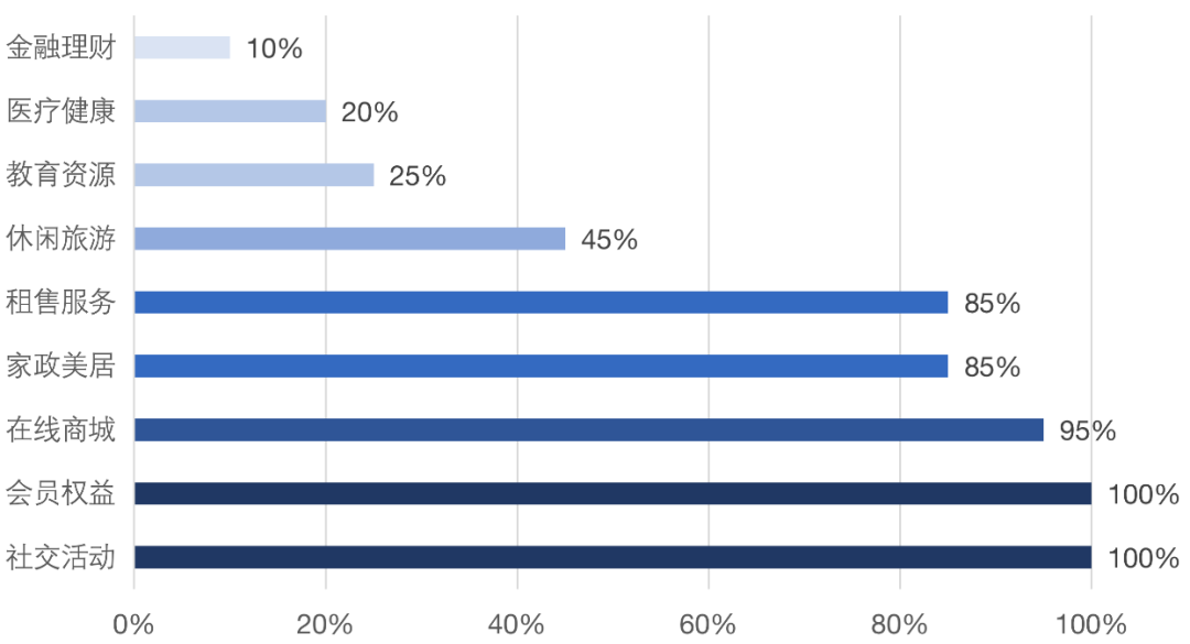 從頭部各家物業(yè)服務的部署情況可以看出,針對智慧通行、在線繳費、管家服務、公告資訊、移動平臺等物業(yè)基礎服務功能已基本具備。而在業(yè)主增值服務方面卻表現(xiàn)的層次不齊,在線商城、家政美居、房屋租售服務、會員權益以及社區(qū)社交活動是目前頭部企業(yè)關注度比較高的,而在醫(yī)療健康、教育、旅游和金融理財?shù)确矫娴耐度胼^少。這是因為目前增值服務尚處于一個探索和初步發(fā)展的階段,還沒有形成成熟的業(yè)務模式,物企也還不具備完善的運營服務和整合多元化產業(yè)資源的能力。