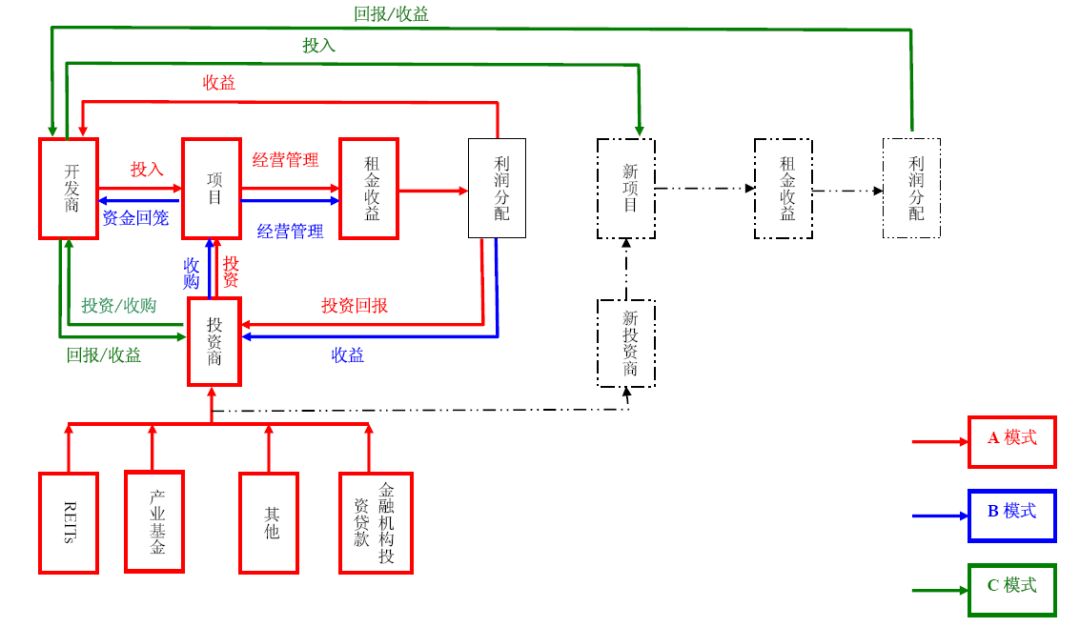 說明:上圖為商業(yè)地產(chǎn)資金鏈運(yùn)作模式凝練。