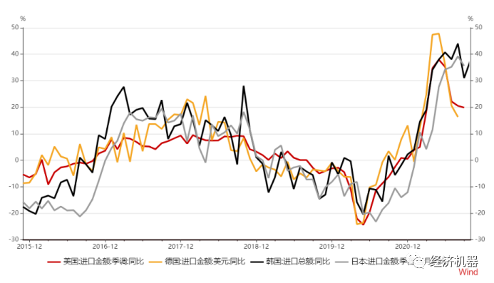 2)各國進口需求依舊旺盛。歐美各國進口增速近期出現(xiàn)一定的回落,但仍維持在20%左右。亞洲各國的出口表現(xiàn)的相對強勢,仍維持在30%以上的增速。特別是韓國,進出口保持強勢(圖4)。韓國有國際貿(mào)易晴雨表的地位,其貿(mào)易進出口持續(xù)強勢,顯示各國需求中短期內(nèi)將保持在一個較強勁的狀態(tài)。