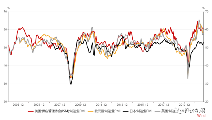 1)主要發(fā)達國家PMI處于高位。美國ISM PMI仍處在60以上的極高景氣狀態(tài),歐元區(qū)PMI連續(xù)4個月高點回落,但仍有58.3。整體來看,主要發(fā)達經(jīng)濟體仍處于較高景氣階段(圖4)。