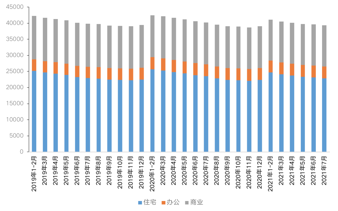 2021年以來,全國整體庫存穩(wěn)中有降,國家統(tǒng)計(jì)局公布數(shù)據(jù)顯示,7月末,商品房待售面積50864萬平方米,比6月末減少215萬平方米。其中,住宅待售面積減少270萬平方米,辦公樓待售面積減少26萬平方米,商業(yè)營業(yè)用房待售面積增加19萬平方米。