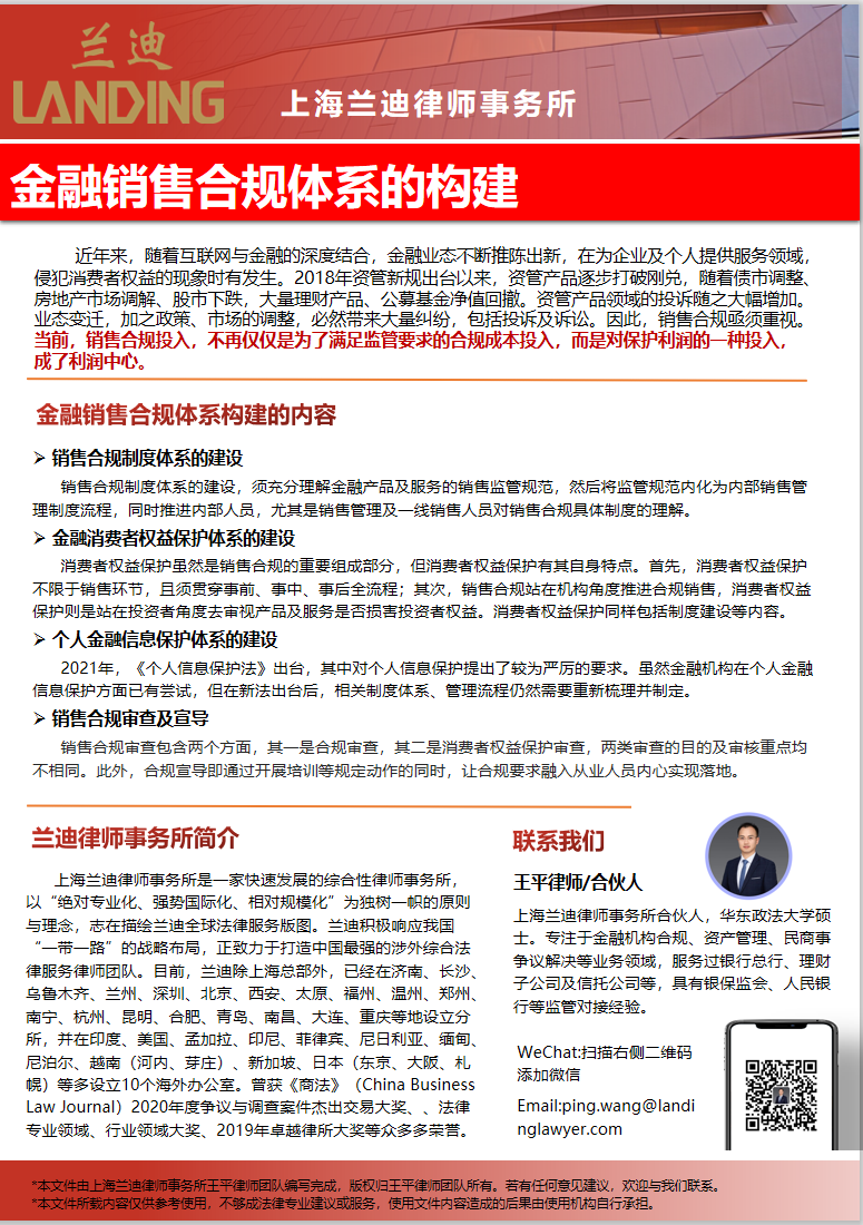 近年來,隨著互聯(lián)網(wǎng)與金融的深度結合,金融業(yè)態(tài)不斷推陳出新,在為企業(yè)及個人提供服務領域,侵犯消費者權益的現(xiàn)象時有發(fā)生。2018年資管新規(guī)出臺以來,資管產品逐步打破剛兌,隨著債市調整、房地產市場調解、股市下跌,大量理財產品、公募基金凈值回撤。業(yè)態(tài)變遷,加之政策、市場的調整,必然帶來大量糾紛,包括投訴及訴訟。銀行分支行及相關銷售機構,加強銷售合規(guī)管理極為必要。本次就金融銷售合規(guī)相關事項進行了系統(tǒng)梳理,包括銷售合規(guī)、個人信息保護及消費者權益保護。如需了解詳情,請與我們聯(lián)系。