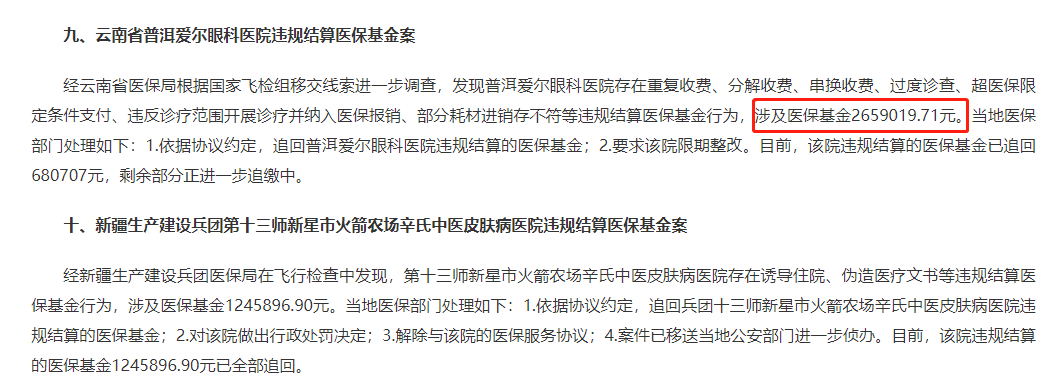 此外,隨著管理規(guī)模擴(kuò)大,公司也面臨著合規(guī)、醫(yī)療糾紛等潛在風(fēng)險(xiǎn)。公開(kāi)資料顯示,愛(ài)爾眼科子公司曾因違規(guī)使用醫(yī)保基金、違法發(fā)布廣告等原因受到行政處罰。比如,國(guó)家醫(yī)保局于2021年6月29日曝光10例典型案例,其中就包括普洱愛(ài)爾眼科醫(yī)院存在重復(fù)收費(fèi)、分解收費(fèi)、串換收費(fèi)、過(guò)度診查、超醫(yī)保限定條件支付、違反診療范圍開(kāi)展診療并納入醫(yī)保報(bào)銷(xiāo)、部分耗材進(jìn)銷(xiāo)存不符等違規(guī)結(jié)算醫(yī)保基金行為,涉及醫(yī)保基金約265.9萬(wàn)元。
