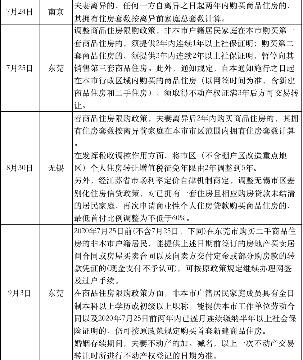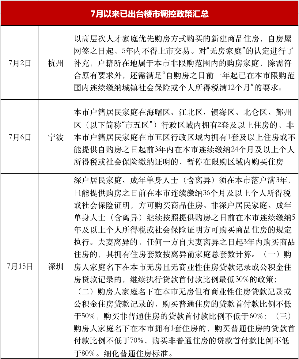隨后,浙江臺州、麗水、海鹽等多個三四線城市發布樓市調控政策,掀起了新一輪三四線城市調控新周期。自7月熱點二線城市紛紛加碼調控至今,地方因城施策,調控正逐漸深入至三四線城市,未來調控大概率將繼續維穩,以更好地落實穩地價、穩房價、穩預期的長期目標。