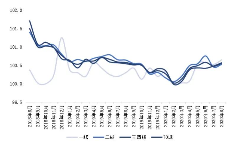 圖:2018年8月以來70城及各能級城市新建商品住宅價格指數環比走勢
