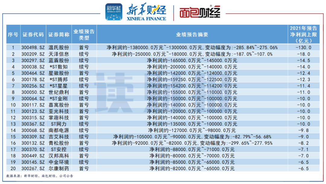 溫氏股份自2015年吸收合并大華農(nóng)上市至今首次虧損,預(yù)計2021年度歸母凈利潤虧損130億元至138億元,成為創(chuàng)業(yè)板的“預(yù)虧王”。天澤信息、藍盾股份、*ST數(shù)知、星徽股份等超過10家公司也預(yù)計虧損超過10億元。