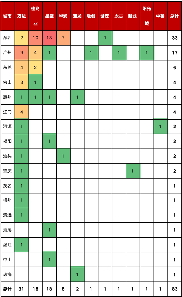 從企業(yè)項目分布來看,萬達布局數量最多,范圍最廣;佳兆業(yè)、星盛擁有本土優(yōu)勢,在廣深形成“寡頭”效應;華潤高度聚焦深圳,其他企業(yè)布局則較為分散。