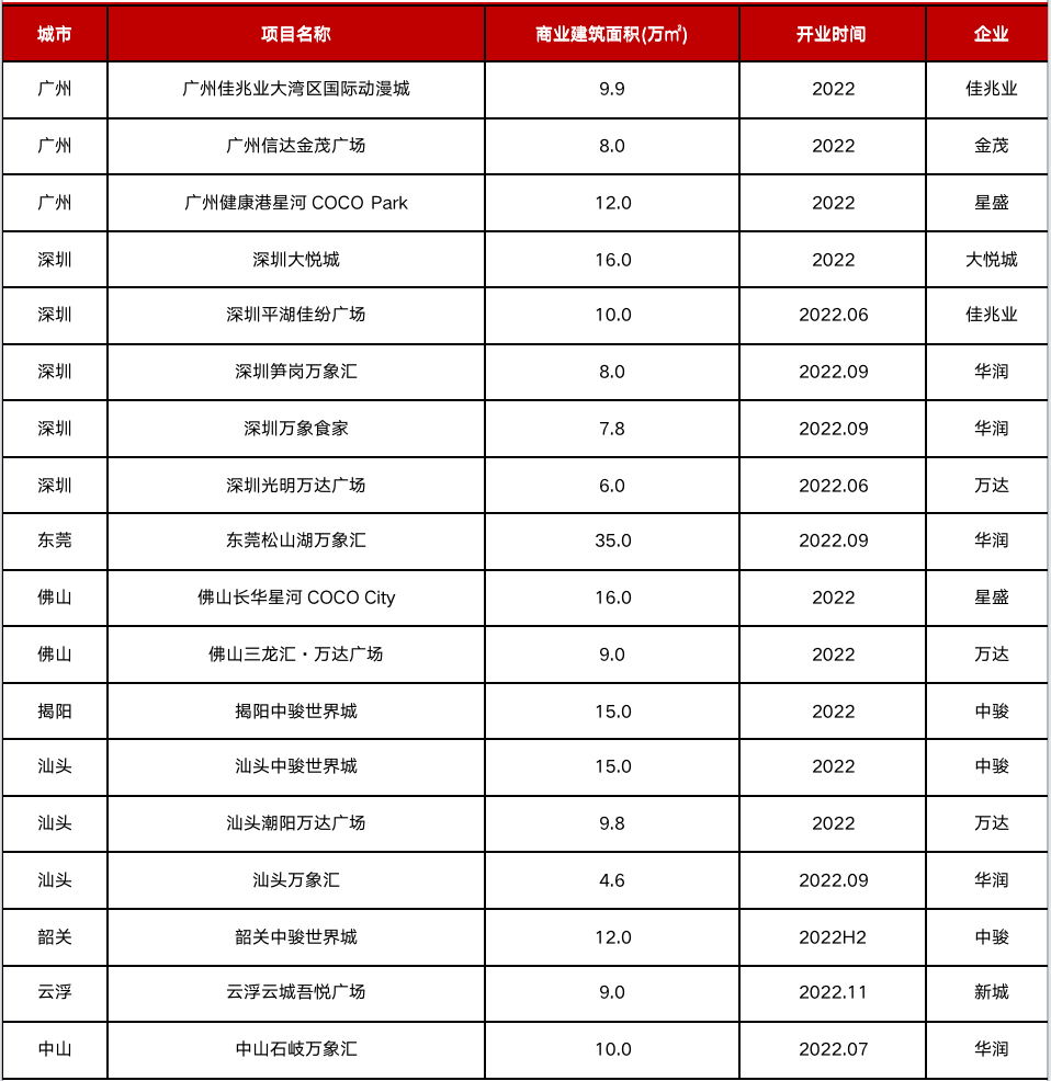 表:2022年典型房企廣東省商業(yè)項目擬開業(yè)項目情況(萬平)