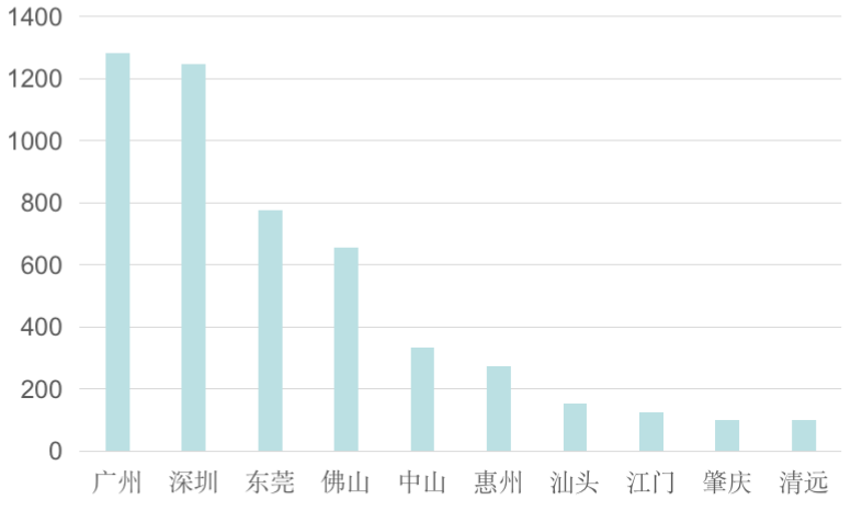 其中深圳數量遙遙領先,廣州位于其后;東莞、佛山、惠州、江門處于第二梯隊,其他城市關注度較低。整體來看熱度集中,深度下沉不夠,廣深“能進則進”,都市圈城市擇機進駐,其他城市“能不進就不進”。