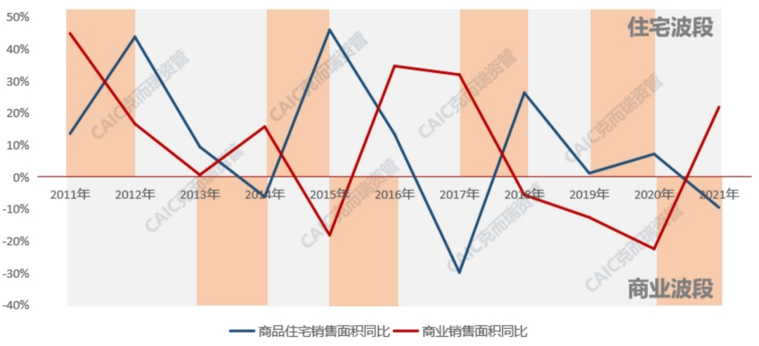 八城住宅與商業(yè)銷售周期背離,兩者存在約3年差異