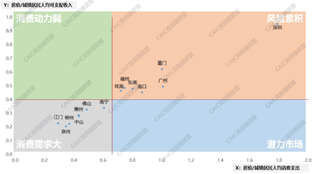 房價占人均可支配收入越高,房價與人均消費支出占比越高,意味著房產消費對商業(yè)消費產生了抑制作用。對珠三角及周邊城市數據分析來看,對于商業(yè)地產投資來說,深圳等高能級城市房價對消費抑制的風險正在累積,而低能級的消費需求仍需要進一步釋放。