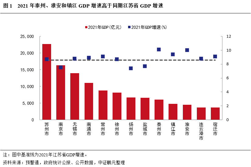 2021年蘇州、南京和無錫GDP規模繼續處于領跑地位,但泰州、淮安和鎮江GDP增速高于同期江蘇省GDP增速。2021年江蘇省13個地級市GDP規模均有所提升,但排位順序未發生變化。從GDP規模看,2021年GDP規模突破萬億的地級市依舊是蘇州、南京、無錫和南通,數量較2020年無變化。2021年,蘇州、無錫和南京GDP總和占江蘇省GDP的45.61%,較2020年下降0.49個百分點。蘇北地區中宿遷、連云港和淮安GDP規模依舊偏弱,依舊處于省內最后三位。從GDP增速來看,2021年由于疫情得到有效控制,各地級市GDP增速均高于2020年。2021年,南京、揚州和鹽城GDP增速低于同期江蘇省GDP增速,泰州、淮安和鎮江雖然廣義債務負擔較重,但2021年GDP增速明顯高于同期江蘇省GDP增速,其余地級市GDP增速基本和江蘇省GDP增速持平。