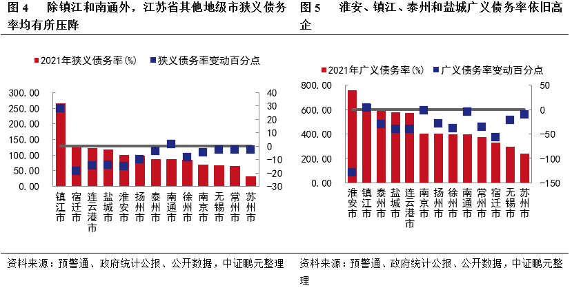債務情況:鎮江市化債壓力依舊較大,洪澤區、高港區和京口區狹義債務率增加明顯,但江蘇省區縣級債務率整體仍有壓降。地級市層面,2021年除鎮江和南通外,其余地級市狹義債務率均有所壓降,2021年鎮江狹義債務率上升27.91個百分點至265.59%,淮安、鎮江、泰州和鹽城的廣義債務率依舊較高。區縣層面,2021年洪澤區、高港區、丹徒區和泗陽縣狹義債務率超過200%,債務負擔較重。蘇州市、無錫市和常州市因財政實力較強,下轄區縣狹義債務率整體偏低,2021年江蘇省95個區縣中有55個區縣狹義債務率較2020年有所壓縮,其中淮安區狹義債務壓縮最明顯(下降81個百分點),2021年新沂市和洪澤區廣義債務率分別超過900%和700%,大豐區、連云區、高淳區、海州區、浦口區和溧水區廣義債務率亦高于600%,但95個區縣中有61個區縣廣義債務率較2020年有所壓降。