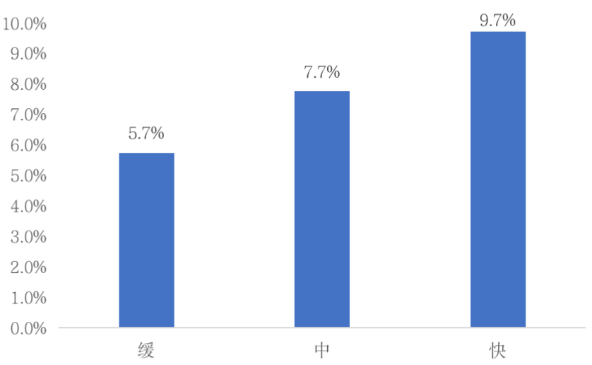 對(duì)比不同增速的城市近十年商品住宅成交面積變化來看,“緩增型”城市的市場規(guī)模增長明顯要慢于“快增型”城市,近十年復(fù)合增長率僅有5.7%,較“快增型”城市低了4個(gè)百分點(diǎn)。