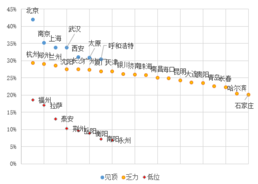 1、“高位見頂”型:大學(xué)生占比超過30%的城市,包括北京、南京、上海、武漢、西安、太原及呼和浩特等7個(gè)城市。這些城市基本均是高等教育資源比較豐富的城市,高學(xué)歷人才儲(chǔ)備資源豐富;近幾年來,在人才政策的利好下,這些城市的大學(xué)生占比進(jìn)一步提升,目前已達(dá)到高位。而隨著人才政策紅利的消失,這些城市的大學(xué)生占比難再大幅提升,因此均屬于人才增長“見頂”型。