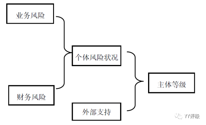 基于以上各家對城投行業(yè)信用風(fēng)險特征的分析,各家評級公司制定了相應(yīng)的評級方法邏輯框架。從邏輯框架來看,大部分評級公司采用了分析業(yè)務(wù)(或稱為“經(jīng)營”)、財務(wù)兩個模塊的風(fēng)險得出個體信用等級,再通過分析外部支持最終得出主體信用級別的方式,如下圖: