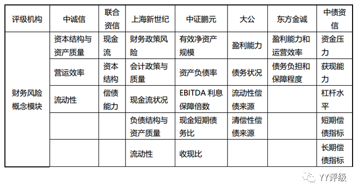 但是中誠信和大公國際以及中債資信的評級邏輯框架在此基礎(chǔ)上有所演化,其中中誠信在業(yè)務(wù)風(fēng)險和財務(wù)風(fēng)險外,將治理與管控單獨(dú)放在一個模塊中,主要從治理水平和管控能力兩個方面衡量。大公國際是將業(yè)務(wù)風(fēng)險和財務(wù)風(fēng)險重新調(diào)整為償債環(huán)境、財富創(chuàng)造能力、償債來源與負(fù)債平衡三個模塊。中債資信則是氛圍資源配置和債務(wù)政策兩個模塊。但是其實(shí)質(zhì)僅是業(yè)務(wù)風(fēng)險和財務(wù)風(fēng)險中的內(nèi)容重新分配的相應(yīng)的個性化模塊中。