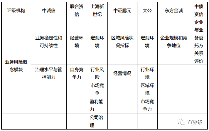 上海新世紀(jì)和大公國際還強(qiáng)調(diào)了行業(yè)風(fēng)險:上海新世紀(jì)對于行業(yè)風(fēng)險要素主要考察行業(yè)的經(jīng)營環(huán)境與競爭態(tài)勢、增長及盈利趨勢、成本變化和風(fēng)險事件、融資環(huán)境變化與趨勢、政府管制與法律風(fēng)險等因素,新世紀(jì)評級對行業(yè)要素進(jìn)行綜合評估和分析,定期賦予行業(yè)風(fēng)險分檔。大公國際則從政策環(huán)境和監(jiān)管框架兩個方面進(jìn)行分析。