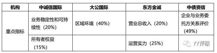 考察采用打分匯總法的評級機(jī)構(gòu)的評級方法可以發(fā)現(xiàn),上海新世紀(jì)的指標(biāo)權(quán)重設(shè)置比較平均,沒有特別突出的關(guān)鍵性指標(biāo);大公國際設(shè)置的指標(biāo)中區(qū)域環(huán)境相對較為重要;中誠信較為重視業(yè)務(wù)穩(wěn)定性和可持續(xù)性以及所有者權(quán)益這兩個指標(biāo);中債資信認(rèn)為企業(yè)與業(yè)務(wù)委托方關(guān)系評價較為重要;東方金誠認(rèn)為營業(yè)總收入和運(yùn)營實(shí)力較為重要。