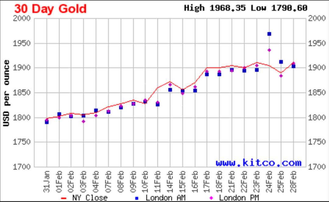 近期受到俄烏沖突影響,2周內(nèi),金價自1850美元沖高到1974美元高點。