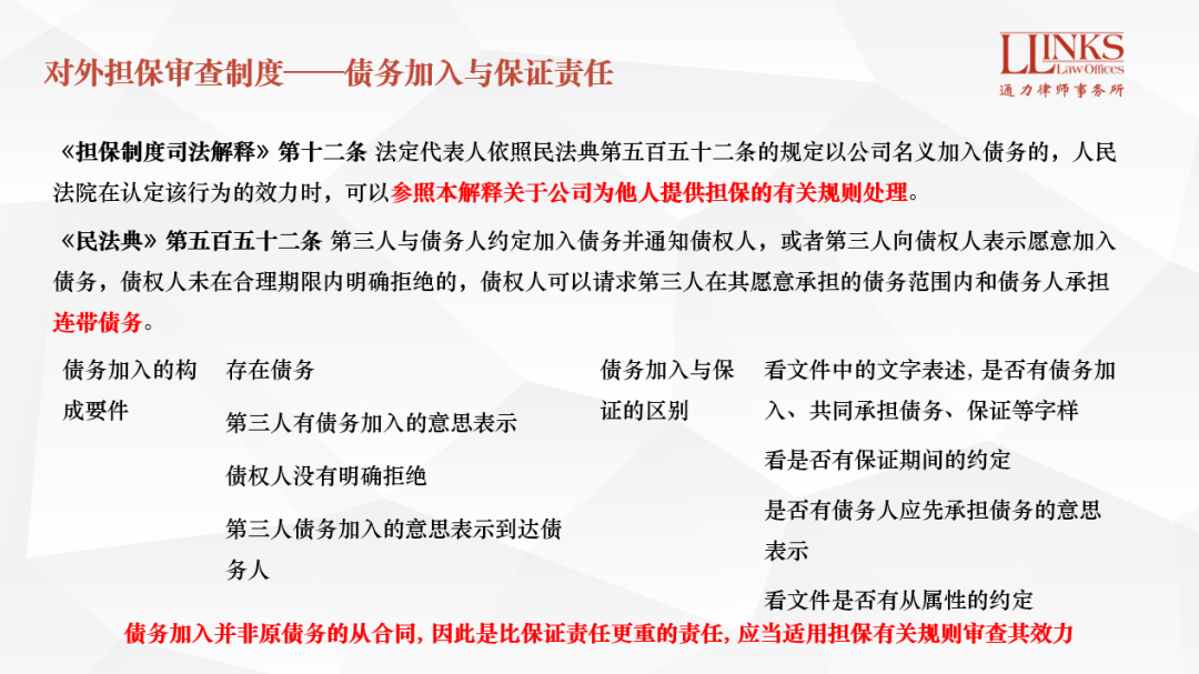 關于債務加入,《擔保制度司法解釋》第12條進行了明確的規定,人民法院在認定債務加入效力時,可以參考該司法解釋為他人提供的有關規則處理,即相對人負有審查債務加入的適格決議的義務。在該等規定背后,最高法的邏輯在于債務加入較對外擔保需要承擔更重的責任,承擔擔保責任后擔保人享有向債務人追償的權利, 但債務加入的第三人承擔債務后并不享有該等追償權, 那么根據舉輕以明重的原則, 既然提供擔保需要適格決議, 債務加入就“更需要”適格決議了。