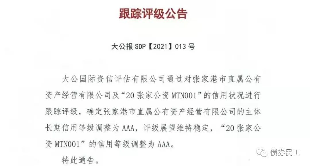 根據(jù)大公國際2021年6月3日披露的跟蹤評級公告,將張家港市直屬公有資產(chǎn)經(jīng)營有限公司(以下簡稱“張家港資產(chǎn)”)的主體長期信用等級由AA+調(diào)整為AAA,成為2021年第3個(gè)主體信用評級調(diào)升至AAA的發(fā)行人(前一個(gè)為常德財(cái)鑫融資擔(dān)保有限公司),也是2021年唯一一個(gè)主體主體信用評級調(diào)升至AAA的城投公司。根據(jù)評級報(bào)告的內(nèi)容,張家港資產(chǎn)本次主體信用評級調(diào)升的原因主要是張家港市經(jīng)濟(jì)和財(cái)政實(shí)力繼續(xù)增強(qiáng)、水務(wù)業(yè)務(wù)和燃?xì)鈽I(yè)務(wù)經(jīng)營良好、公司投資收益同比大幅增長和政府補(bǔ)助的有力支持等。
