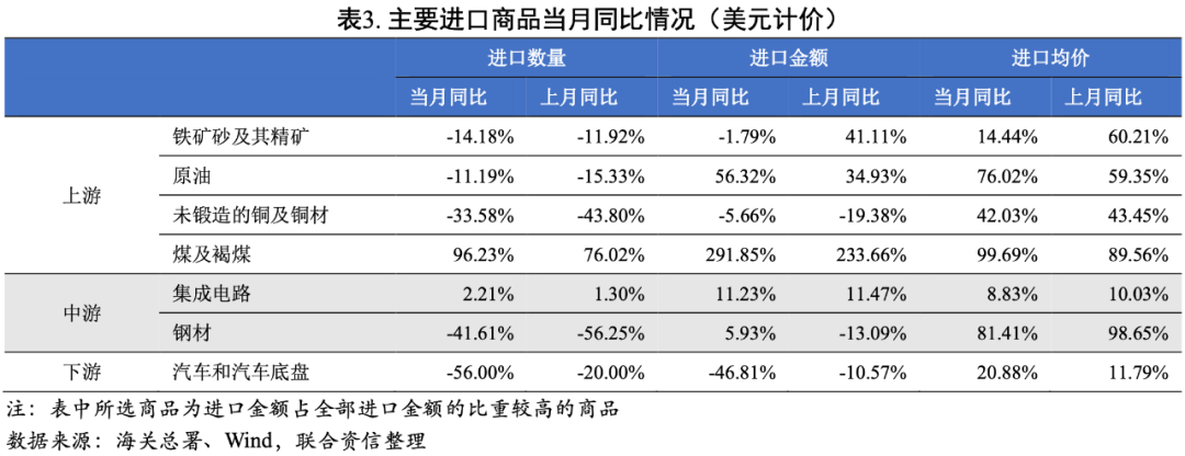進口方面,從主要進口商品來看,煤炭因為冬季供暖需求量較大,進口數(shù)量大幅上升;集成電路由于全球供應(yīng)鏈短缺導(dǎo)致進口數(shù)量增速維持低位;價格上漲疊加國內(nèi)需求減弱導(dǎo)致鐵礦砂、原油、銅、鋼材以及汽車的進口數(shù)量均同比減少。年內(nèi)能耗雙控壓力仍然較大,國內(nèi)工業(yè)生產(chǎn)承壓,導(dǎo)致對海外原料的需求下降,同時疊加疫情反復(fù)對消費的制約,預(yù)計進口數(shù)量或?qū)⒗^續(xù)下降。