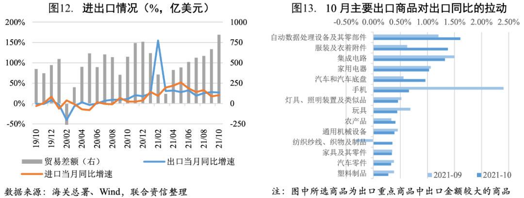 2021年10月我國貨物進出口總額5159.03億美元,同比增長24.30%,增速仍然較高;但環(huán)比(-5.30%)有所下降。其中,出口3002.21億美元,同比增長27.10%,仍然維持較高增速,環(huán)比小幅下降1.80%,依然表現(xiàn)出較強的韌性,一方面是由于歐美作為主要需求國,產(chǎn)需缺口依然較大,另一方面出口替代效應(yīng)導(dǎo)致我國出口增加。進口2156.80億美元,同比增長20.60%,主要是價格上漲和去年基數(shù)(較低)因素導(dǎo)致;環(huán)比下降9.70%,符合往年下行規(guī)律。整體看,內(nèi)需對進口的支撐作用較弱。貿(mào)易順差845.40億美元,創(chuàng)歷史最高值。2021年前10個月貿(mào)易順差累計5106.35億美元,已接近去年全年水平,今年順差規(guī)模或?qū)?chuàng)歷史最高,對經(jīng)濟的拉動作用或?qū)⒂兴嵘?/p>