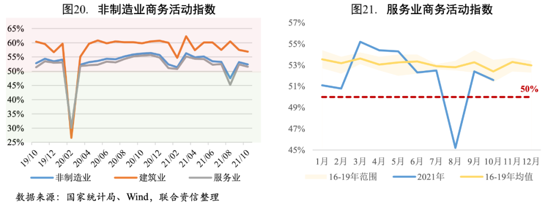2021年10月,非制造業(yè)商務(wù)活動指數(shù)較上月回落0.80個百分點至52.40%,非制造業(yè)繼續(xù)保持擴張,但擴張幅度減小。其中服務(wù)業(yè)景氣度小幅回落,商務(wù)活動指數(shù)下降0.80個百分點至51.60%,主要是多點散發(fā)式疫情給尚處于恢復(fù)過程中的服務(wù)業(yè)帶來較大沖擊。從行業(yè)情況來看,受國慶節(jié)拉動,與假期消費密切相關(guān)的住宿、餐飲、生態(tài)保護及環(huán)境治理、娛樂等行業(yè)商務(wù)活動指數(shù)均位于55%以上較高景氣區(qū)間。但受疫情和天氣等影響,消費者更傾向于就地過節(jié)或短途周邊游,10月鐵路運輸、航空運輸?shù)刃袠I(yè)商務(wù)活動指數(shù)雖位于榮枯線以上,但擴張力度相對較弱,景氣水平不及近年同期。建筑業(yè)景氣度同步小幅回落,商務(wù)活動指數(shù)下降0.60個百分點至56.90%,但仍位于較高景氣區(qū)間,建筑業(yè)生產(chǎn)持續(xù)增長。