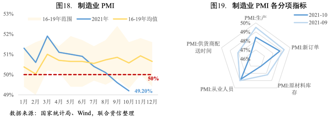 主要行業(yè)方面,10月醫(yī)藥制造業(yè)工業(yè)增加值仍保持15%以上的較快同比增速,但增速較上月有所回落;受季節(jié)性需求增加、為電商促銷和海外圣誕季積極備貨等因素帶動,電子設(shè)備制造、食品制造等行業(yè)工業(yè)增加值同比增速提升明顯;非金屬礦物制品、黑色金屬冶煉及壓延加工業(yè)、汽車制造業(yè)、紡織業(yè)工業(yè)增加值同比增速繼續(xù)下滑,其中非金屬礦物制品、黑色金屬冶煉及壓延加工業(yè)主要受到環(huán)保限產(chǎn)、地產(chǎn)端降溫的影響,汽車制造產(chǎn)能擴張承壓仍然主要受限于芯片短缺因素,紡織業(yè)主要是上年同期基數(shù)較高所致。