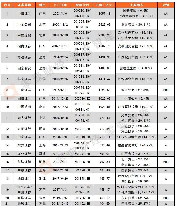 同時在A股和H股上市的有13家,其中,海通證券、光大證券、東方證券、國泰君安注冊地為上海,中國銀河、中信建投、中金公司注冊地為北京,注冊地為廣東的分別為中信證券、廣發證券、招商證券,華泰證券、國聯證券注冊地為江蘇,中原證券注冊地為河南。