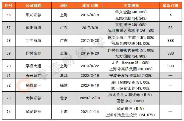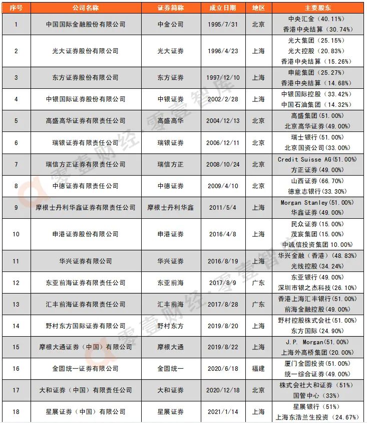 據零壹智庫不完全統計,目前已成立的合資證券公司有18家,其中外資控股的9家,分別為匯豐前海、瑞信證券、高盛高華、瑞銀證券、摩根士丹利華鑫、摩根大通、野村東方、大和證券和星展證券。這18家合資證券公司注冊地為上海的9家,北京6家,廣東2家,福建1家。