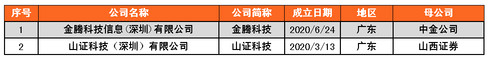 √ 券商金融科技子公司有2家,分別為金騰科技信息(深圳)有限公司(金騰科技),山證科技(深圳)有限公司(山證科技),注冊地均在廣東。