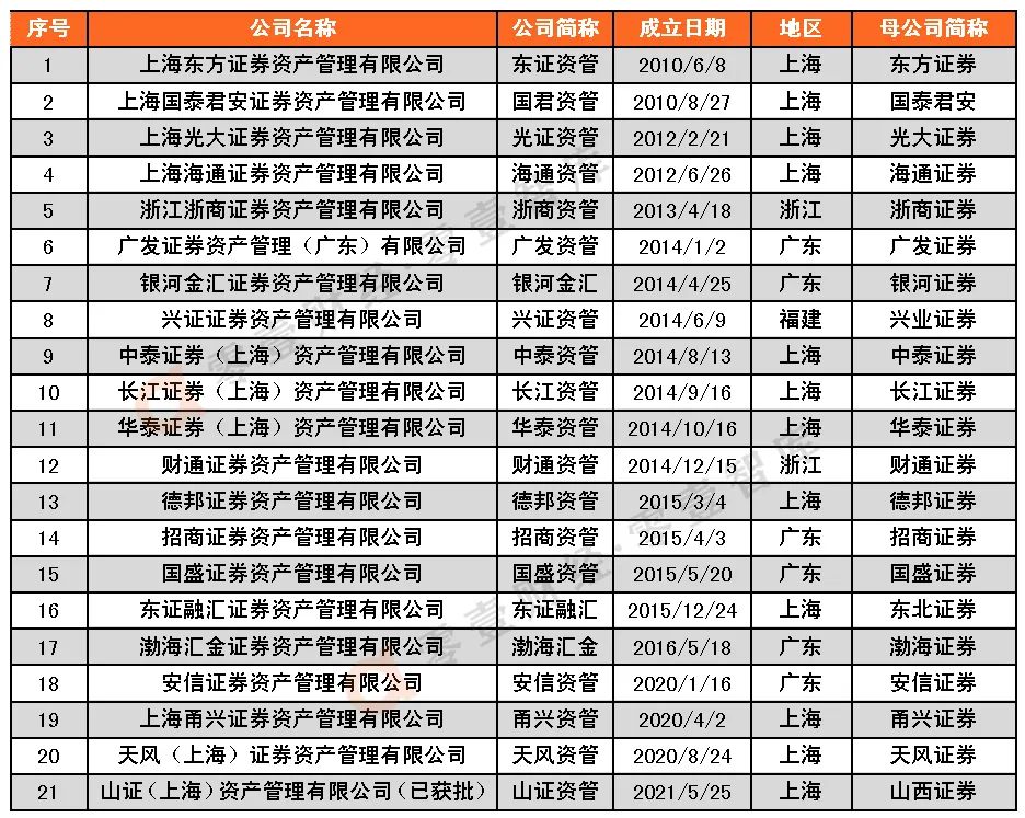 截至2021年7月2日,券商資管子公司有21家,注冊地分布在上海(12家),廣東(6家),浙江(2家),福建(1家)四個省市。自2018年4月27日央行《關于規范金融機構資產管理業務的指導意見》(以下簡稱“資管新規”)正式發布,已有4家證券公司獲批成立資管子公司。