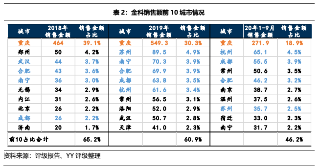 其他城市方面,2020年前三季度公司銷售金額來自全國超過50座城市,其中銷售排名前10大城市合計占比為46.2%,較往年顯著下降,公司的業(yè)績分散度進一步提升。從占比來看,公司未在其他城市中培育出“第二個重慶”,持續(xù)貢獻業(yè)績城市包括成都、合肥、杭州、蘇州等華東和西南城市。
