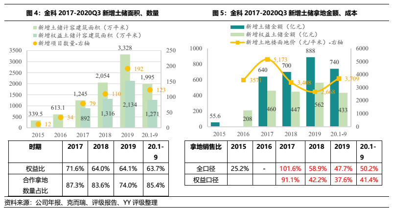公司規(guī)模擴張迅速得益于過去幾年積極拿地,考慮到2015年房地產(chǎn)行業(yè)在銷售端和融資端均放松調(diào)控,所以回溯來看公司把握住了這一波“寬松周期”,踩點時機較好。2016-2020年前三季度,公司每年拿地數(shù)量和投入均大幅增加,至2019年達到新高,新增項目192個,拿地金額(全口徑)888億元。就拿地銷售比來看,2017年最為激進,全口徑和權(quán)益口徑分別高達101.6%和91.1%,但一方面隨著公司加大合作拿地,降低項目權(quán)益比;另一方面公司銷售額逐漸擴大,2018-2020年前三季度權(quán)益口徑拿地銷售比降至40%左右的水平。