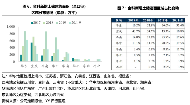 從拿地區(qū)域變動來看,過往重慶市為公司第一大重倉地,2017、2018年新增土儲建面中43.7%和34.7%位于重慶,但自2019年起無論是新增建面的絕對值還是占比均持續(xù)下降,公司似乎有意弱化對重慶市場的依賴度,提高分散程度。與此同時,公司持續(xù)踐行其“三圈一帶”的布局策略,不斷增加華東、西南(不含重慶)、華中和華南地區(qū)的土儲,尤其華東區(qū)域2020年前三季度新增建面占比達到31.4%,超過重慶及西南地區(qū)之和,成為公司新的重倉地。